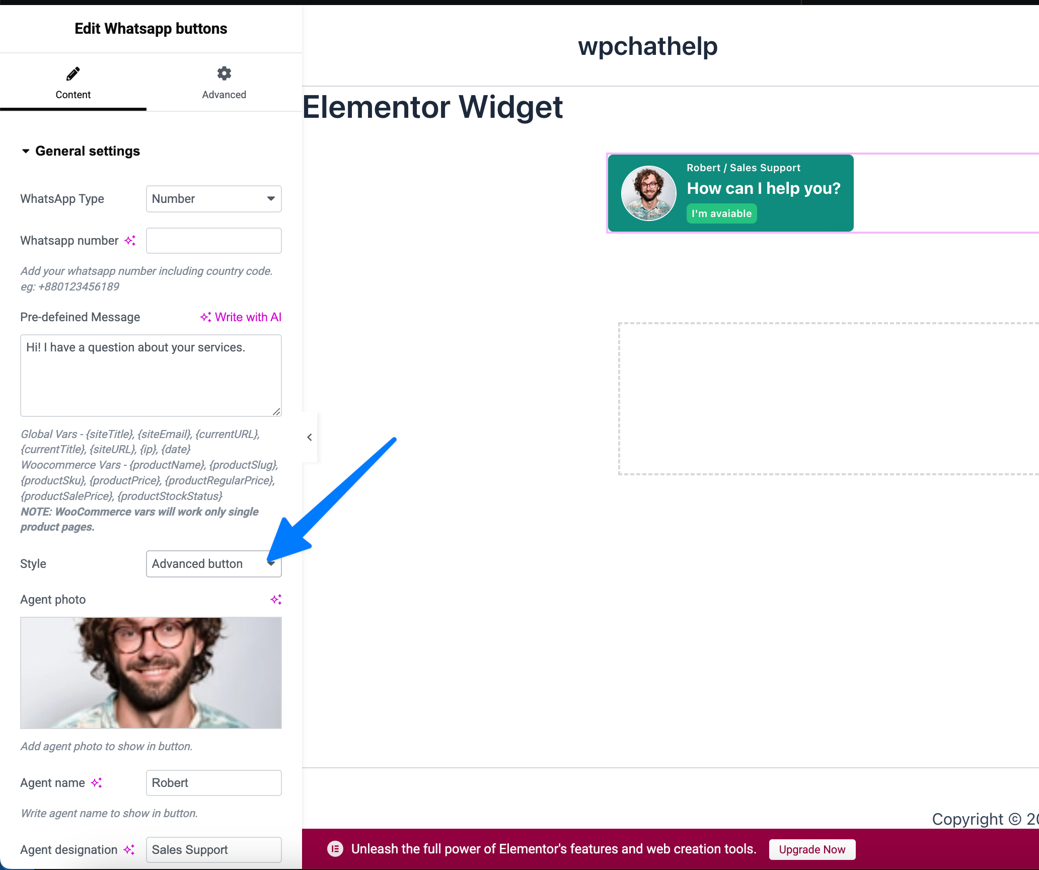 - Advanced Button → Displays agent photo, name, designation, and status (ideal for support teams).