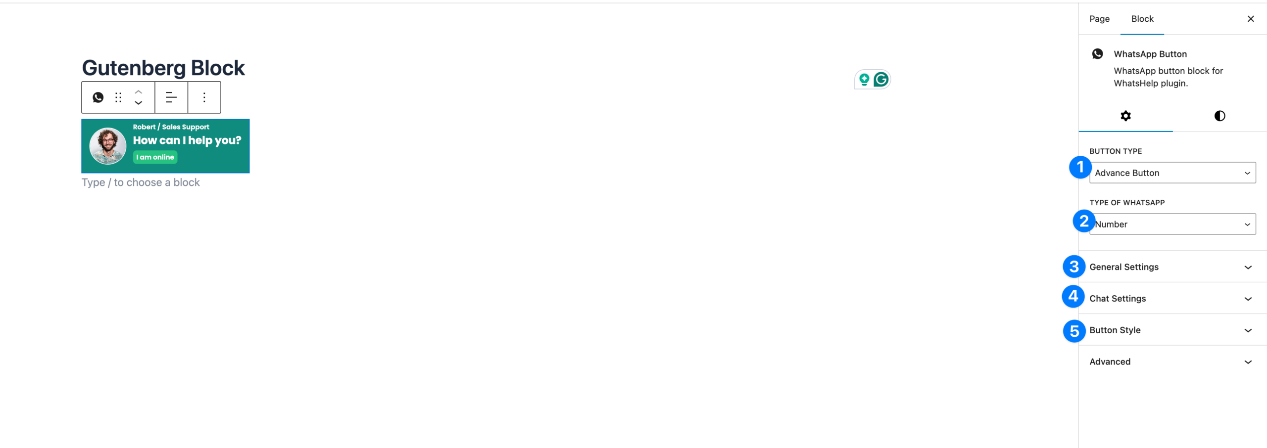 The plugin provides a dedicated WhatsApp Button block for the WordPress Gutenberg editor. This allows you to insert and customize a WhatsApp button without needing shortcodes.