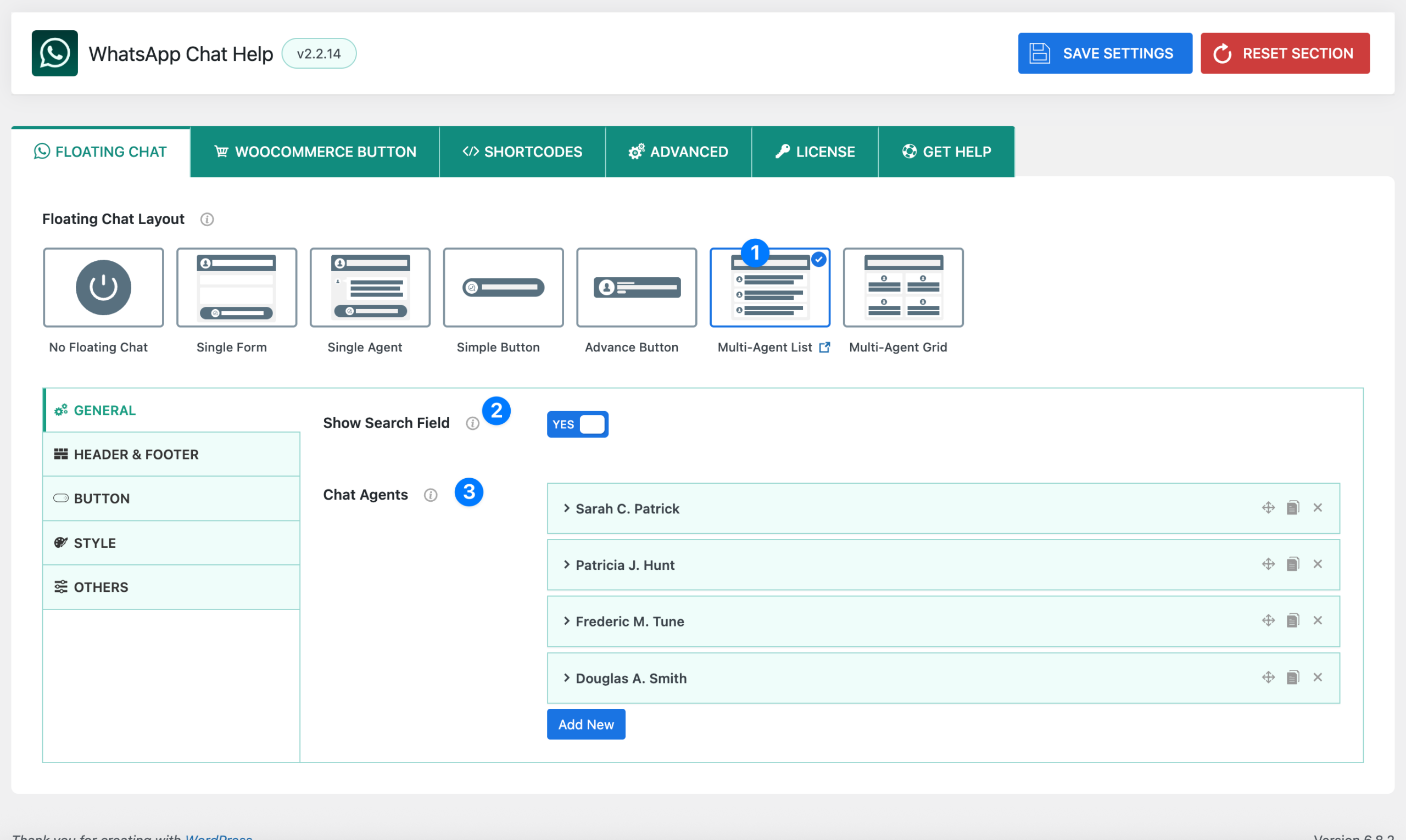 - Layout Selector – Multi-Agent List: Choose the Multi-Agent List layout from the Floating Chat Layout options. This layout displays agents in a vertical list format, showing their names (and optionally photos, designations, and statuses).
